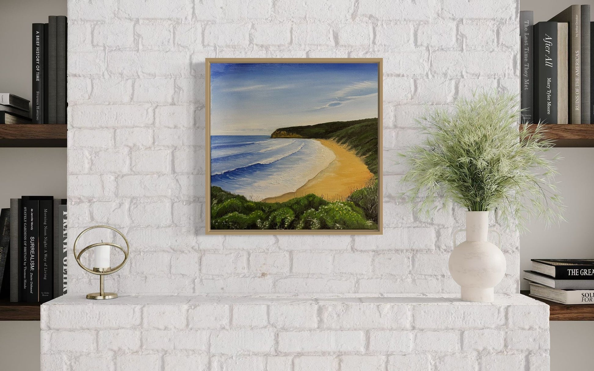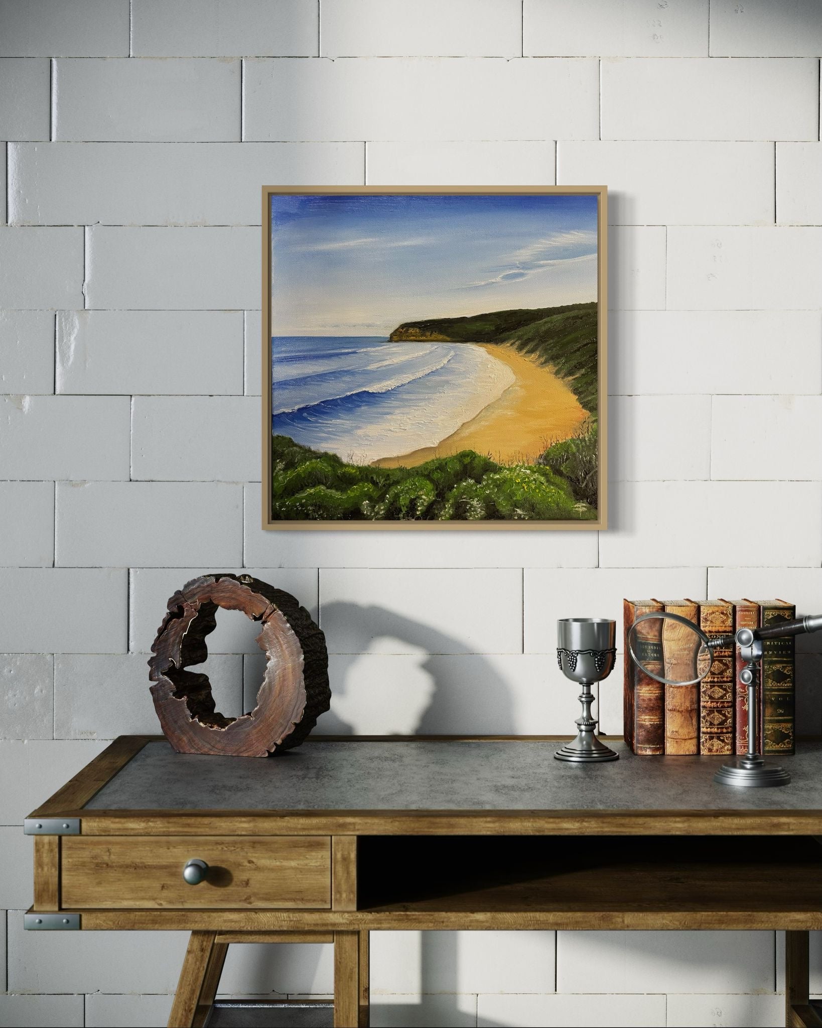 A beautiful surf beach surrounded by beautiful greenery and a beautiful sunny day. The sounds of the waves rolling into the shore and light breeze in the air. You can feel the peace and calm cone through the painting.