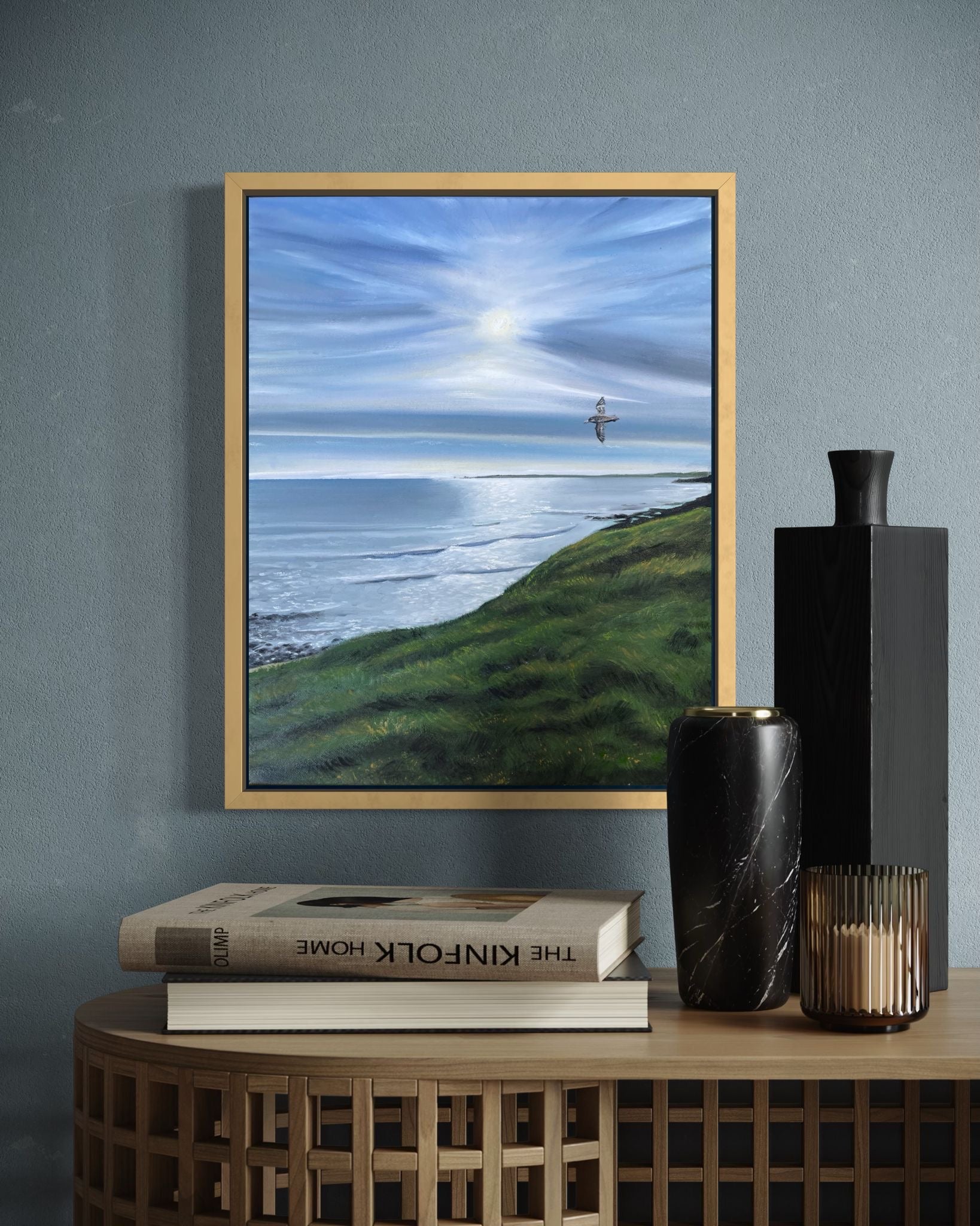 Flying high with a shearwater in the clouds, watching the waves roll in over the grass of Phillip Islands stunning shoreline. Feel the peace and calm of the air and beauty of being at the beach. Painting is 16 x 20 Inches with a timber frame. Wrapped in bubble wrap then packaged in a carboard box for protection. Copyright remains to artist Sharnee Taylor Free Shipping within Australia