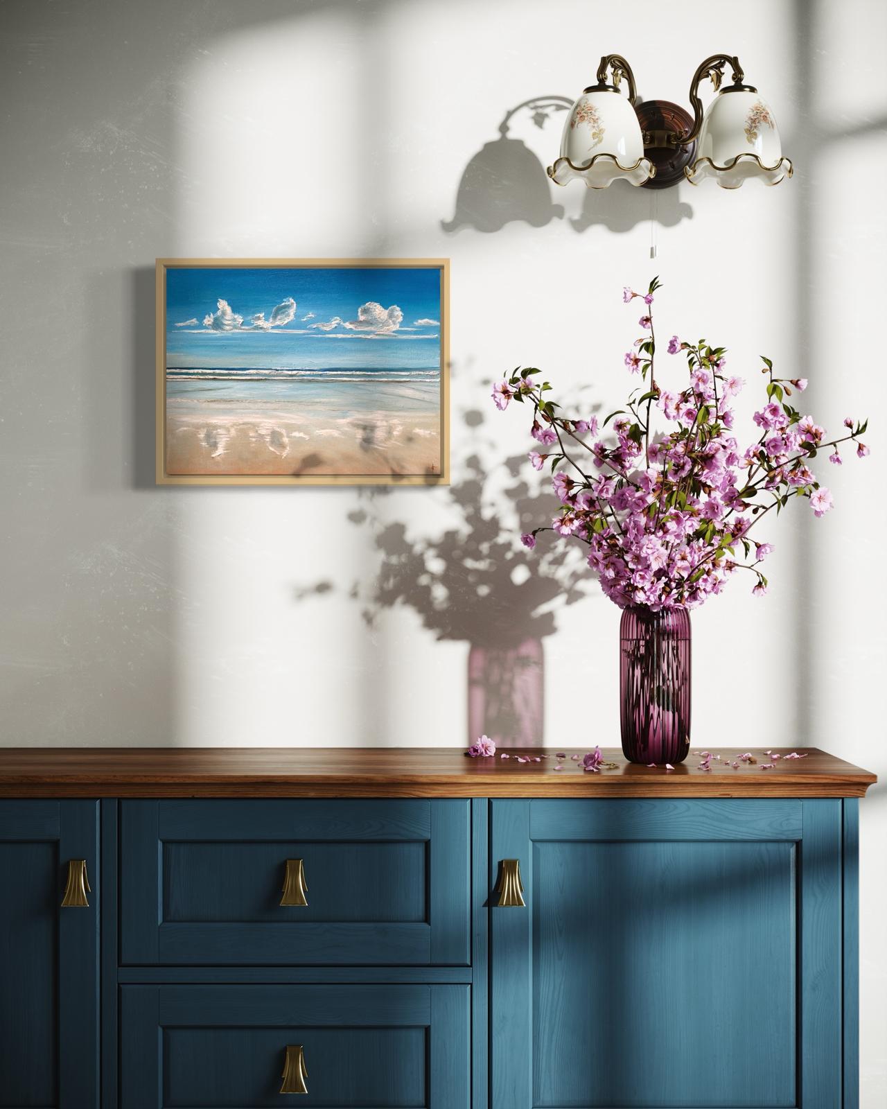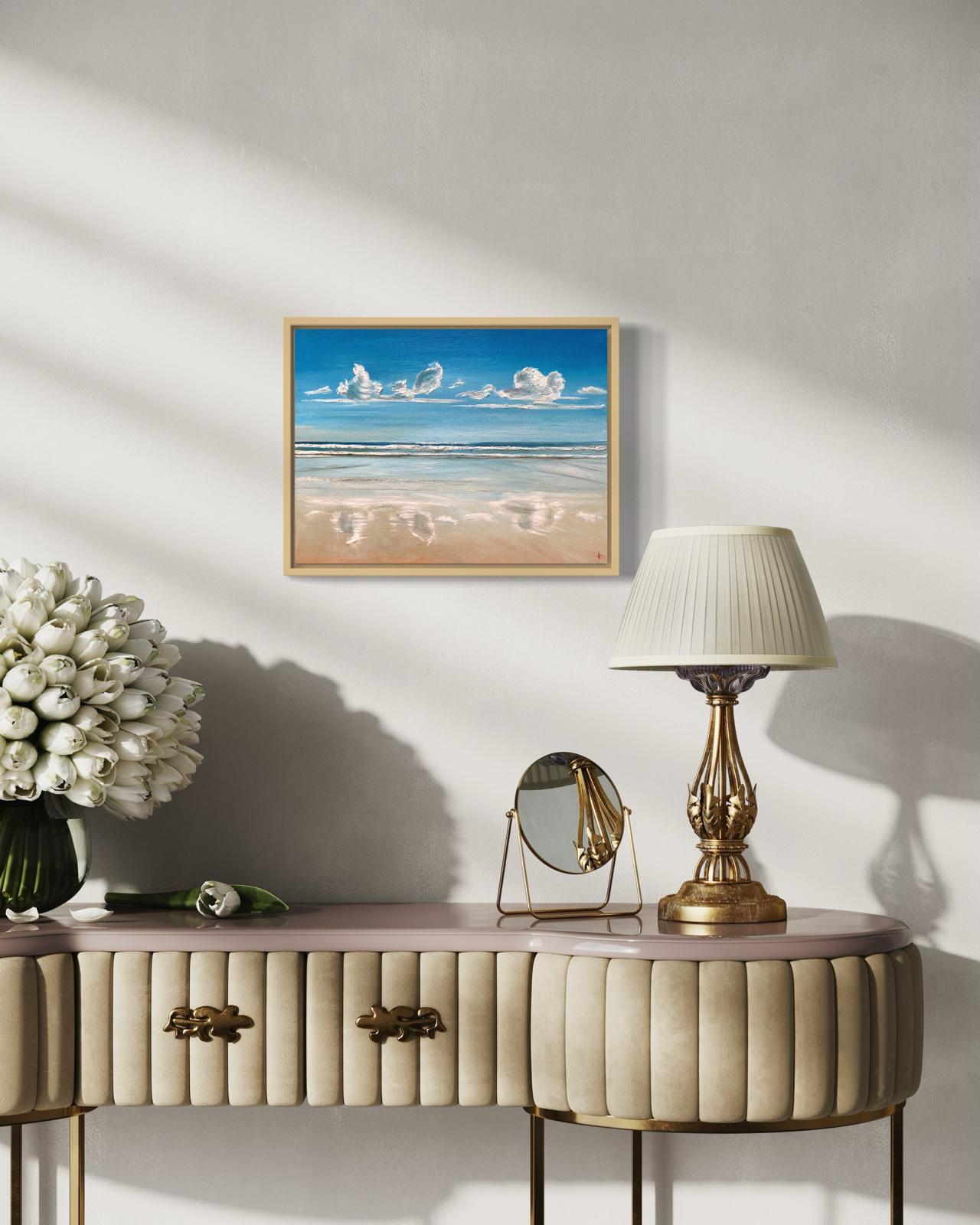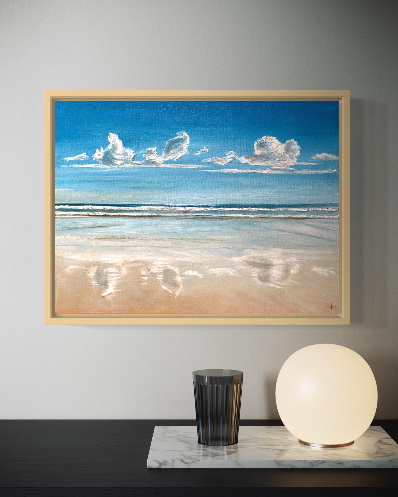 The beautiful reflections of clouds, the sun and waves on the golden sands of our beach. This beach was painted from Phillip Island but could be any beach in the world.