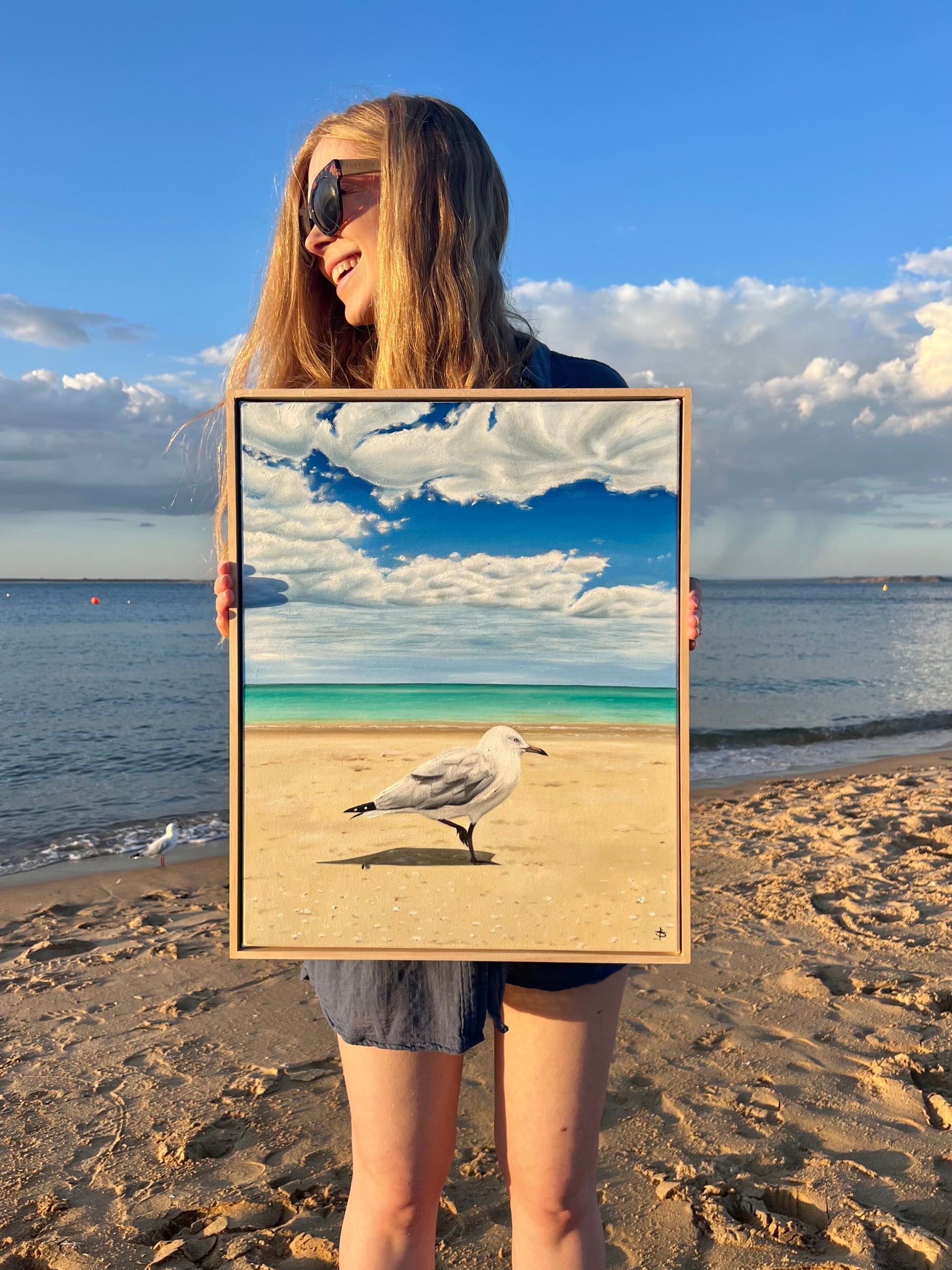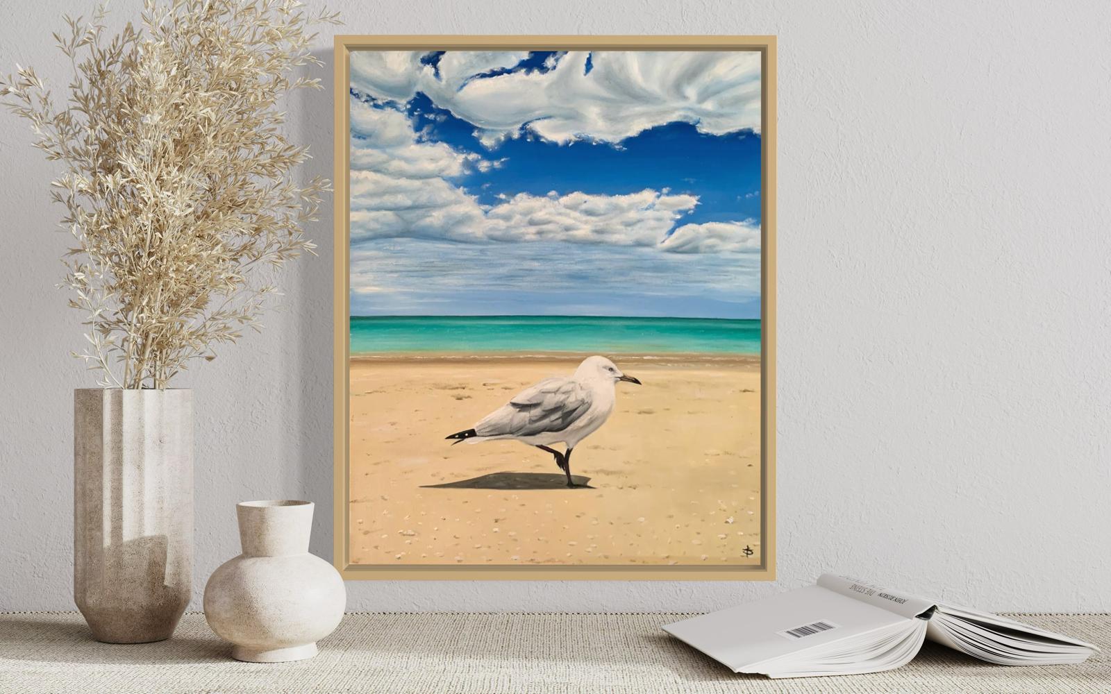 This painting captures that warm calming feeling you get when you are sitting on the beach in summer watching the cloud slowly roll over head and birds fly by. Some birds play close by and some in the distance. You can sit and enjoy this feeling every time you look at this painting.